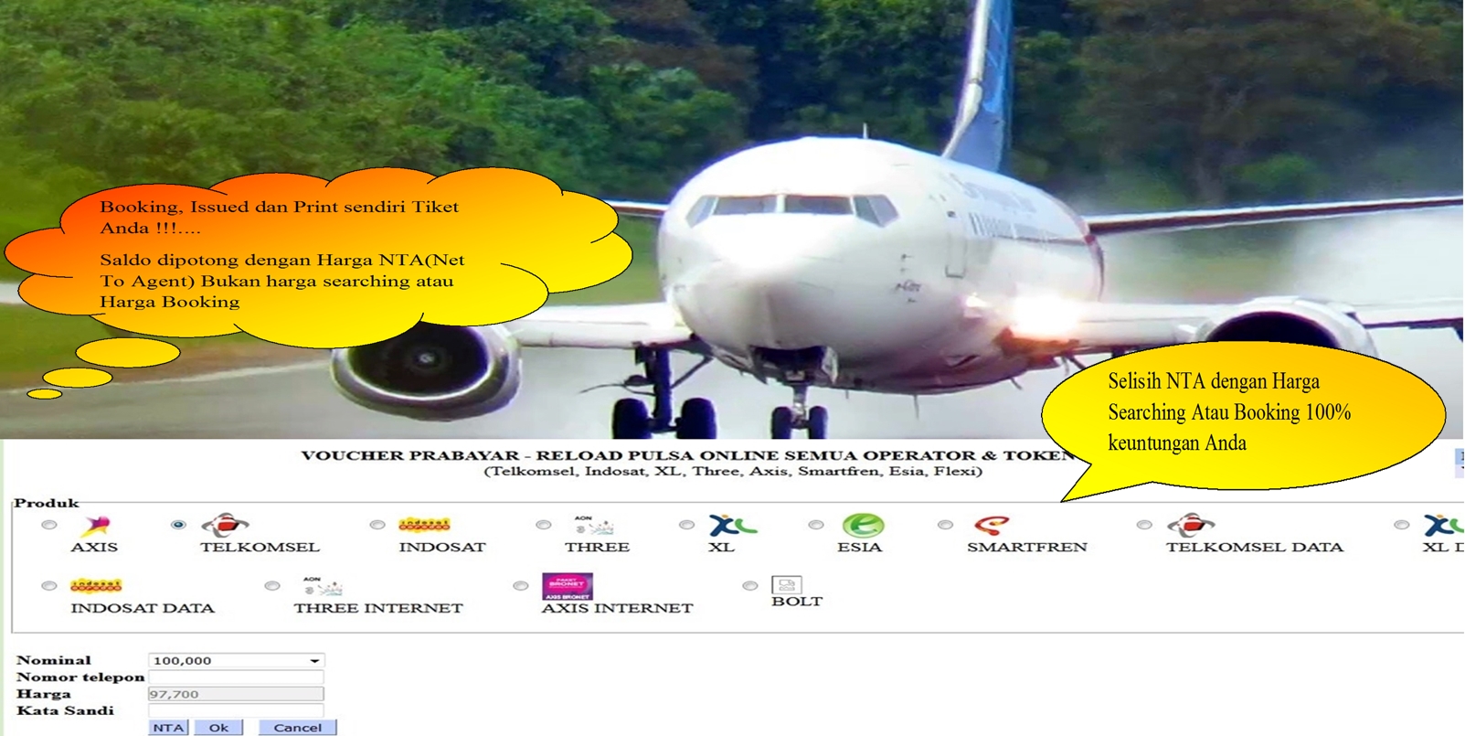 Merupakan keutamaan kami untuk senantiasa membantu anda menjalani bisnis tiket pesawat, KAI, PELNI, pulsa HP all operator,PDAM,Pemesanan Kamar Hotel Dll, untuk mendapatkan keuntungan yang tidak terbatas